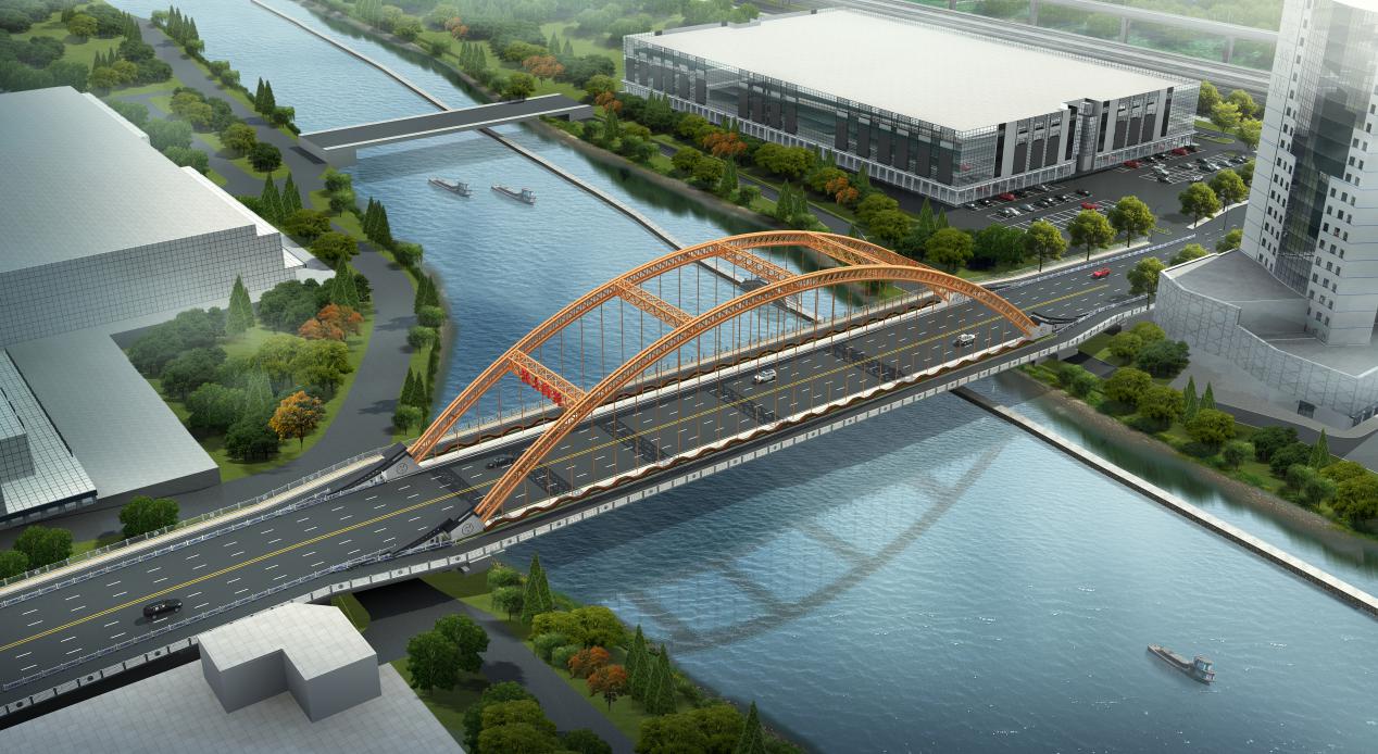 金柯橋大道104國(guó)道口輕紡城大橋改建工程范圍南起104 國(guó)道,北至萬(wàn)商路,全長(zhǎng)552.38m,采用雙向六車(chē)道城市主干路標(biāo)準(zhǔn),設(shè)計(jì)速度50km/h,總投資約1.4億元。工程內(nèi)容包括新建一座跨越運(yùn)河的鋼管砼系桿拱梁主橋,對(duì)現(xiàn)狀獨(dú)山地道進(jìn)行入口改造,新建東升路地下人行通道聯(lián)通市場(chǎng)東西,大橋南北引橋下各建設(shè)一條下穿過(guò)路。